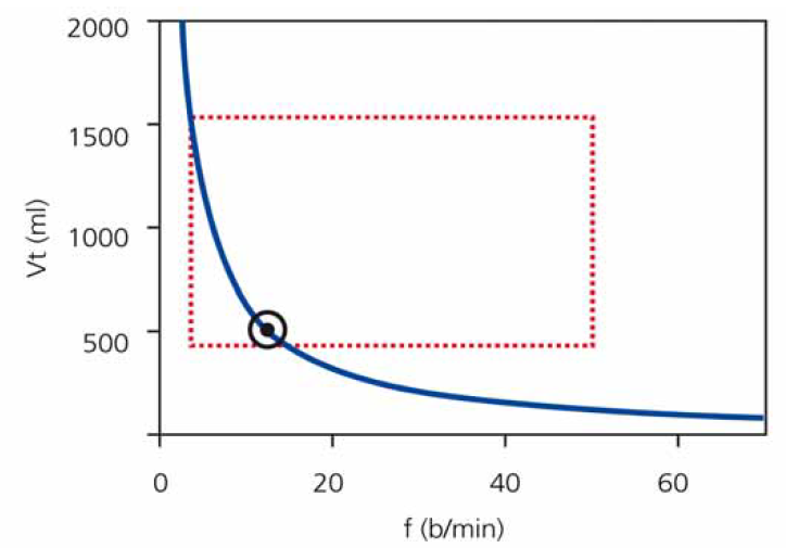 Figura 4: pattern respiratorio ottimale (cerchietto nero sulla curva blu) e limiti della ventilazione (rettangolo rosso) (5).