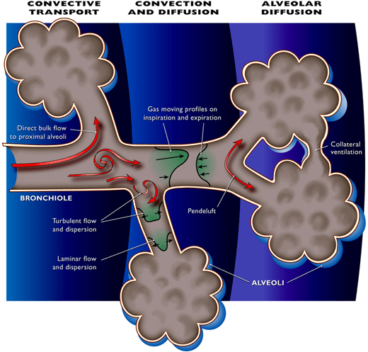 - l’asimmetria dei profili di flusso inspiratori ed espiratori, grazie alla quale i gas ricchi di ossigeno risultano essere trasportati più velocemente nella porzione inferiore delle vie respiratorie, grazie ai loro profili di flusso più netti e penetranti, mentre i gas poveri di ossigeno, i cui profili di flusso risultano più smussi, vengono efficientemente trasportati verso la porzione superiore delle vie aeree;