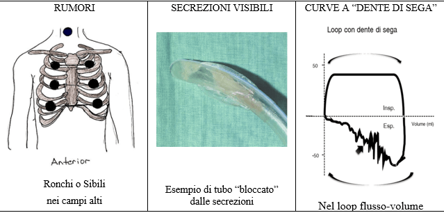 L’aspirazione delle secrezioni deve avvenire se sono presenti rumori respiratori (ronchi o sibili nei campi alti, principalmente espiratori), secrezioni visibili nel tubo tracheale o tracheostomico o nel catetere-mount o presenza di alterazioni delle curve di ventilazione con la tipica evidenza dell’aspetto a “dente di sega” nel loop flusso-volume o nella fase espiratoria del diagramma flusso-tempo.
