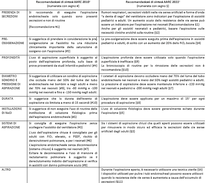 L’aspirazione della via aerea artificiale è una pratica di assistenza al malato critico utilizzata fin dall’introduzione della prima protesi respiratoria endotracheale. Il “come” farlo si è modificato negli anni, partendo da usi e costumi locali degli operatori sanitari trasmessi ai colleghi nei percorsi di inserimento lavorativo, evolvendo sui risultati delle prove di efficacia, le evidence based practice, fino ad arrivare ad essere codificato un po’ per tutti in una nota Clinical Practice Guidelines (CPG) del 2010 diffuso da AARC, American Association for Respiratory Care1, che forniva indicazioni sull’aspirazione delle vie aeree artificiali durante ventilazione meccanica. Oggi, a distanza di 12 anni, l’AARC fa un passo avanti e propone un unico documento per tutti i setting assistenziali, intitolato “AARC Clinical Practice Guidelines: Artificial Airway Suctioning”2. Per una lettura attenta ed approfondita del documento, si rimanda direttamente al link https://rc.rcjournal.com/content/67/2/258#:~:text=The%202010%20AARC%20CPG1,the%20appropriateness%20score%20at%207)