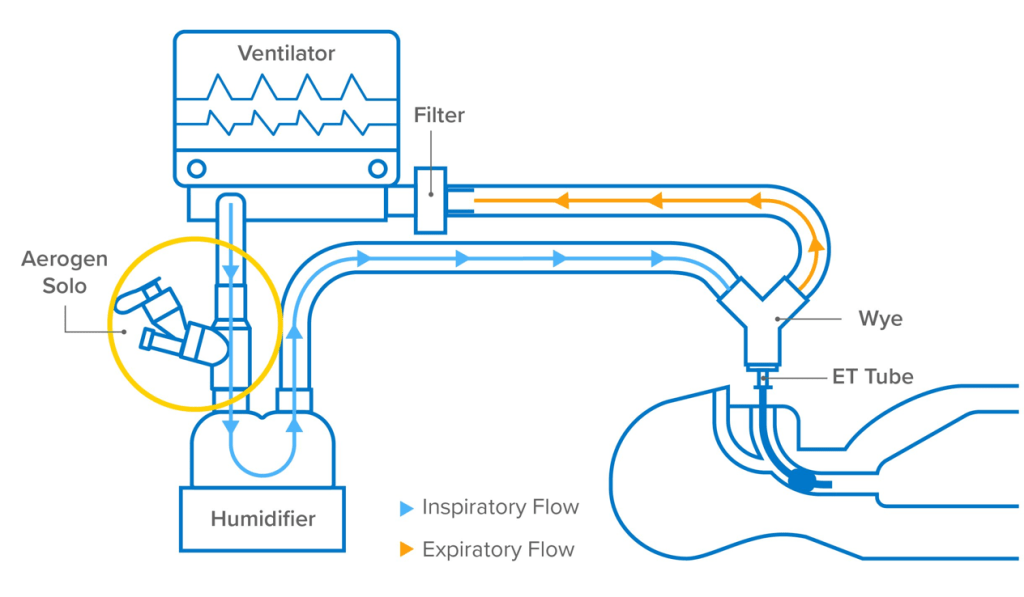 Con i pMDI, per ottenere la massima efficacia, bisogna erogare il farmaco vicino al tubo endotracheale (raccordo a Y) [2]. Mentre, con il nebulizzatore a getto e a membrana vibrante, si riporta una dose maggiore di farmaco quando posti vicino al ventilatore; il motivo è perché questi sistemi possono erogare farmaco in continuo (sia in fase inspiratoria che espiratoria) [1,2]. Gli autori hanno ipotizzato che l’aerosol erogato in continuo, lontano dal paziente, possa essere trattenuto dalla branca inspiratoria, come un serbatoio, durante la fase espiratoria [2]. La terapia inalatoria, è tuttavia influenzata dal tipo di trigger inspiratorio. Il trigger a flusso è progettato con il passaggio di un flusso continuo di gas o bias flow tra la valvola inspiratoria ed espiratoria. Pertanto, il bias flow è un elemento che influenza la somministrazione dei farmaci aerosol [2]. Con 2 e 5 L/min di bias flow, VMN e JN risultano a maggior ragione più efficienti se posizionati vicino al ventilatore e non prossimali al paziente (raccordo a Y) [2], dove la dose di farmaco viene veicolata più facilmente verso la branca espiratoria [2]. Si ricorda che il nebulizzatore a membrana vibrante è il sistema più efficiente in termini di maggior dose di farmaco erogata [2]. I sistemi Aerogen Pro o Solo, sono esempi di nebulizzatori mesh progettati per essere compatibili con i circuiti del ventilatore meccanico. Nel manuale d’uso del sistema Aerogen Solo è indicato il posizionamento sul lato secco dell’umidificatore (Fig 3), quindi all’ingresso dell’umidificatore [9]. Tuttavia, Anderoson e colleghi hanno notato che non ci sono differenze sull’efficacia del farmaco erogato, posizionando VMN all’entrata o all’uscita dell’umidificatore [6].