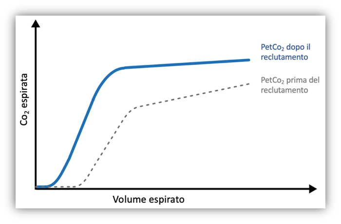 In un’ottica di reclutamento, la Fase I del tracciato può ridursi leggermente, indicando una diminuzione dello spazio morto anatomico. La pendenza della Fase II tende a diventare più accentuata, riflettendo un miglioramento della perfusione polmonare. Infine, la pendenza della Fase III mostra un miglioramento, attribuibile a una espirazione più omogenea del gas dai diversi compartimenti polmonari, segno di una ventilazione più uniforme.