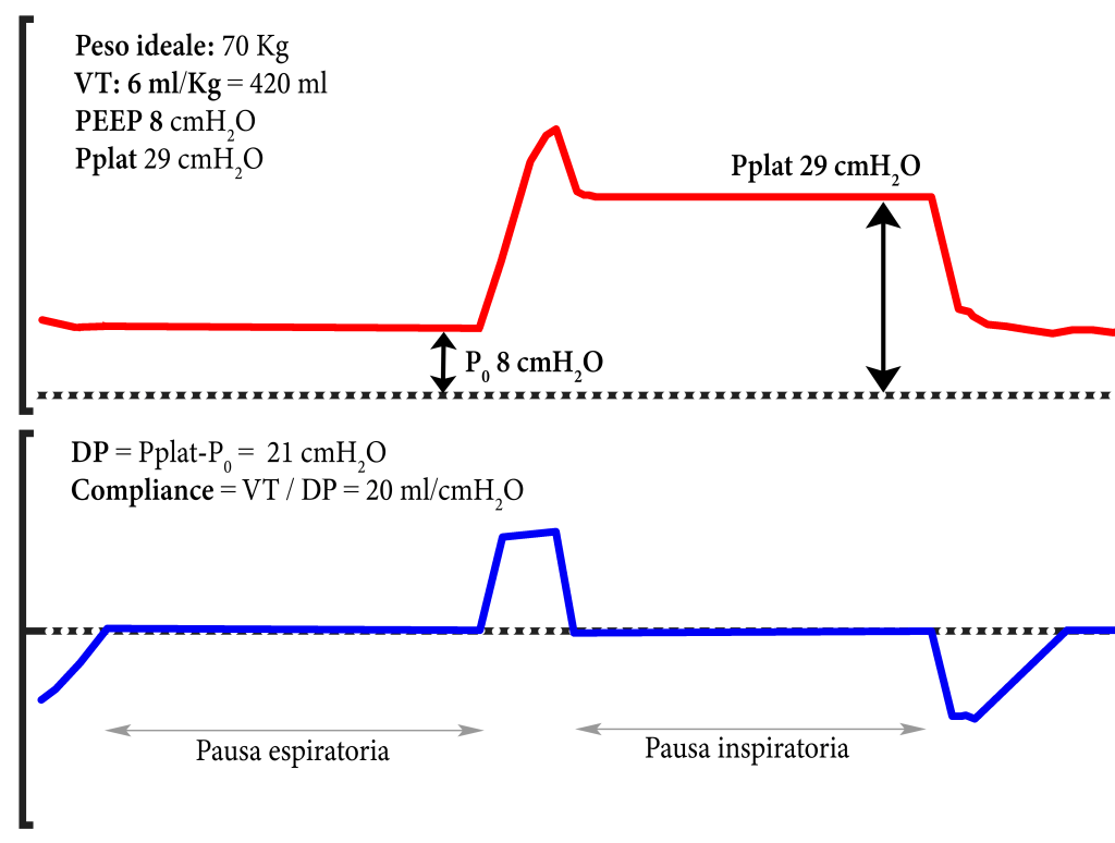 - In un paziente di 70 kg con compliance di 20 mL/cmH₂O, un VT di 6 mL/kg (420 ml) genera una DP di 21 cmH₂O (Immagine 1), un valore eccessivo secondo le evidenze attuali. In tali condizioni (quadro molto grave) se non sopraggiunge una grave acidosi respiratoria (pH < 7.15), il VT dovrebbe essere ridotto a 4 mL/kg (280 ml), per ottenere una DP 14 cmH₂O.